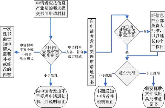 信息產(chǎn)業(yè)部或者省、自治區(qū)、直轄市通信管理局應(yīng)當(dāng)自發(fā)出受理申請通知書之日起20個工作日內(nèi)完成審查工作,作出批準或不予批準的決定。20個工作日內(nèi)不能做出決定的,經(jīng)信息產(chǎn)業(yè)部或者省、自治區(qū)、直轄市通信管理局負責(zé)人批準,可以延長10個工作日,并將延長期限的理由告知申請人。予以批準的,出具正式批準文件;不予批準的,書面通知申請人并說明理由。