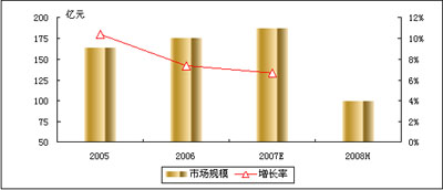 賽迪顧問定義的電信應用是指運營商、設(shè)備提供商、系統(tǒng)集成商針對各行業(yè)特點提供的電信解決方案和電信服務。2008年上半年,中國電信行業(yè)應用市場規(guī)模達到99.2億元人民幣,同比增長8.3%。賽迪顧問預測,2008年全年中國電信行業(yè)應用市場規(guī)模將突破200億元,同比增長7.1%,持續(xù)平穩(wěn)增長的趨勢。