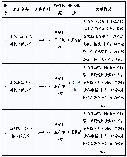 據(jù)悉,這3家增值電信企業(yè)是北京飛龍無(wú)限科技有限公司,存在明碼標(biāo)價(jià)不規(guī)范問(wèn)題;北京聯(lián)動(dòng)飛天科技有限公司,未提供服務(wù)卻扣費(fèi);深圳市互動(dòng)科技有限公司,未提供服務(wù)卻扣費(fèi)。