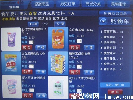 記者在家樂福IPTV購物平臺上看到,商品的種類相當(dāng)豐富,按日常用到的分成了食品、嬰兒、美容、百貨、運動、文具、飲料幾個大類,而每一類里又分成不同的小類,比如美容類里又分護(hù)膚、清潔、男士、彩妝、紙巾等小類。其價格與在家樂福購物相同,并且還有不少產(chǎn)品在打折。滿118元即可免費配送,對于沒有時間、精力逛超市的人來講,可以說相當(dāng)方便。