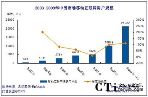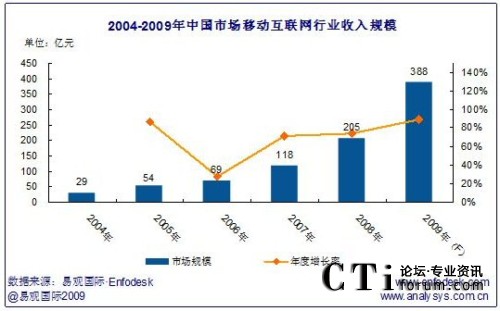 2009年中國市場移動互聯(lián)網行業(yè)收入規(guī)模將達388億,年增長率達111.78%。