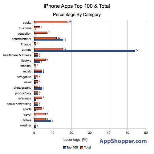 下圖是iPhone和iPod touch的Top100軟件(藍(lán)色)與軟件總數(shù)量(橙色)在各個軟件類別中的分布比例?梢钥闯觯