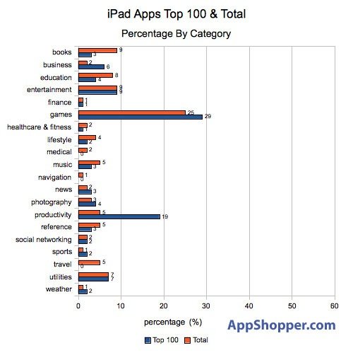 而在iPad的Top100軟件與總應(yīng)用數(shù)量在各個軟件類別的分布比例圖中: