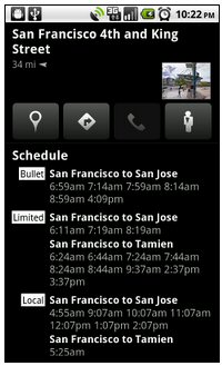 在公共交通地點(diǎn)頁(yè)面中還能看到新版的時(shí)刻表,你可以點(diǎn)擊地圖上的任何一個(gè)中轉(zhuǎn)站點(diǎn)的圖標(biāo)來(lái)打開(kāi)一個(gè)新的頁(yè)面查看未來(lái)車次的發(fā)車時(shí)間,這樣可以更好的安排自己的行程,這項(xiàng)功能支持任何提供有在線時(shí)刻表的地鐵、巴士或者火車車站。