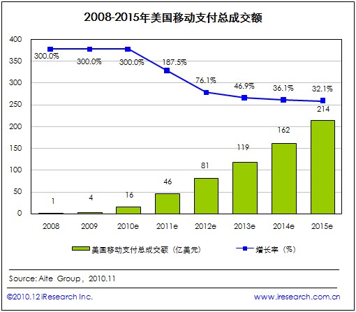 艾瑞咨詢(xún)根據(jù)Aite Group發(fā)布的數(shù)據(jù)發(fā)現(xiàn),2010年美國(guó)移動(dòng)支付總成交金額預(yù)估值為16億美元,預(yù)計(jì)2015年這一數(shù)字將攀升至214億美元,將是2010年的13.4倍,復(fù)合年增長(zhǎng)率為68%。長(zhǎng)期以來(lái),美國(guó)移動(dòng)支付總成交額一直處于被低估的狀態(tài),但它的實(shí)際表現(xiàn)遠(yuǎn)比預(yù)想要好很多。其中,2010年到2011年增長(zhǎng)率將高達(dá)187%。