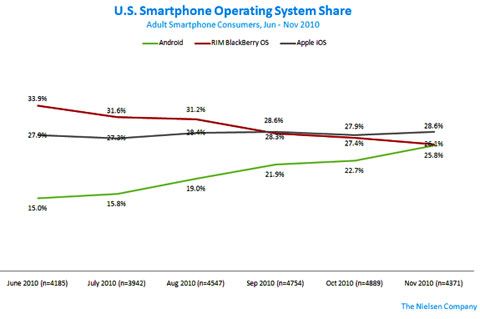 尼爾森的報告認為,自智能手機在數(shù)年前成為一個數(shù)十億美元的市場后,為爭奪手機“消費市場份額的競爭已經(jīng)變得空前激烈”。尼爾森在稍早的報告中表示,由于蘋果、谷歌和RIM的智能手機用戶進一步增加,智能手機市場增勢在短期內(nèi)不會趨緩。