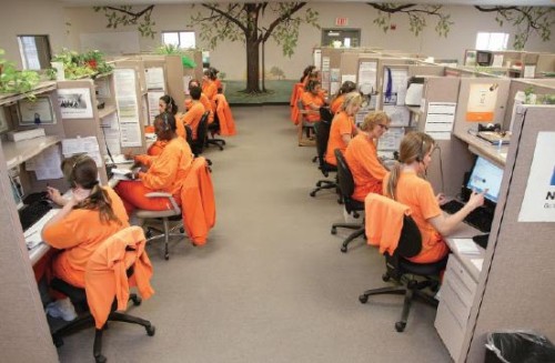但古德溫邁出了回歸體面人生的艱難步伐,并已獲得了一份工作,4月份刑滿后可上任,這一切都多虧了一家名為威爾帝電信(Televerde)的公司。該公司在佩里維爾監(jiān)獄運(yùn)營著四個呼叫中心,包括250名輪候上班的身著橘黃色連身衣的“女士”(員工們很享受這個稱呼),員工必須接受脫衣搜查,有時還要接受保安的盤問。但一旦戴上耳機(jī),她們就進(jìn)入了另一個世界!霸谀抢锟梢灾厥白宰稹!惫诺聹乇硎荆褳槌霆z后的生活攢下了8,000美元的儲蓄。威爾帝電信是一家私營企業(yè),董事長詹姆斯·胡克(James