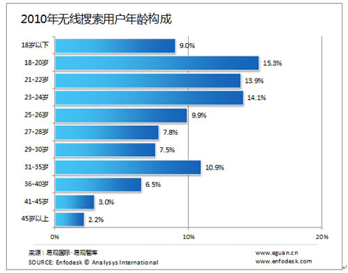 據(jù)Enfodesk易觀智庫(kù)近期發(fā)布的研究表明:中國(guó)無(wú)線搜索市場(chǎng)用戶(hù)結(jié)構(gòu)在2010年已經(jīng)發(fā)生巨大變化。對(duì)比2009年數(shù)據(jù)來(lái)看,無(wú)線搜素用戶(hù)在性別、年齡、職業(yè)分布方面,已經(jīng)發(fā)生快速的變化。
