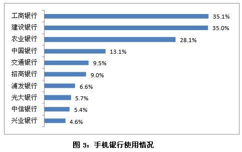 在對手機銀行用戶對手機銀行使用的情況分析來看,工商銀行(601398,股吧)手機銀行的使用率依然最高,達(dá)35.1%,建設(shè)銀行(601939,股吧)緊隨其后,為35.0%。通過進(jìn)一步的分析發(fā)現(xiàn),在經(jīng)常使用手機銀行的用戶中,對建設(shè)銀行手機銀行的使用率(37.4%)略高于對工商銀行的使用率(36.0%),這表明建設(shè)銀行的用戶相對養(yǎng)成了使用手機銀行的習(xí)慣。另外,農(nóng)業(yè)銀行(601288,股吧與中國銀行的使用率在這半年中都有顯著提升,不斷縮小與行業(yè)領(lǐng)跑者的差距。