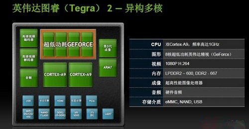 而英偉達(dá)圖睿Tegra 2就是專為移動(dòng)市場而設(shè)計(jì)的超級芯片,Tegra 2雙核處理器采用了40納米工藝制程,有兩顆Cortex-A9處理器,主頻高達(dá)1GHz。Tegra 2處理器芯片只有1/4個(gè)硬幣大小,雙核以更低的功耗實(shí)現(xiàn)同等性能,多任務(wù)處理速度提升一倍,尤其是處理Flash以及HTML5的速度最快。