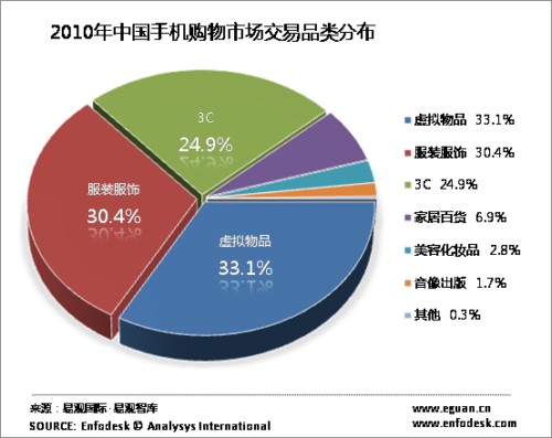 數(shù)據(jù)顯示2010年虛擬交易規(guī)模占比仍然居于交易品類的首位。虛擬交易包括手機(jī)充值、網(wǎng)游充值、網(wǎng)購(gòu)彩票以及機(jī)票等業(yè)務(wù)。手機(jī)購(gòu)物的發(fā)展周期特征呈現(xiàn)于PC端電子商務(wù)類似特征,不同的是手機(jī)端消費(fèi)與服務(wù)的便捷性強(qiáng)相關(guān)。易觀研究認(rèn)為,高標(biāo)準(zhǔn)化、便捷性消費(fèi)是首先爆發(fā)的類目,如手機(jī)充值、彩票。未來(lái)此類交易仍然會(huì)是手機(jī)購(gòu)物的主流。
