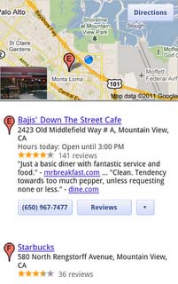 當(dāng)用戶在移動(dòng)設(shè)備上搜索周圍商店位置時(shí),那么他當(dāng)前所在的位置將出現(xiàn)在地圖上,而且地圖上還會(huì)顯示用戶周邊營業(yè)場(chǎng)所的位置。