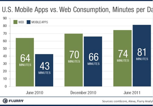 Flurry發(fā)現(xiàn)平均每用戶花在移動應(yīng)用上的時間比網(wǎng)絡(luò)多出9%。僅在1年前,用戶平均每天在應(yīng)用上花費(fèi)43分鐘,在網(wǎng)絡(luò)上花費(fèi)64分鐘。而現(xiàn)在,用戶在應(yīng)用上的時間增至81分鐘,增幅達(dá)91%。原因為用戶使用的應(yīng)用類型和數(shù)量增加,而非平均時長有大幅增加。花在網(wǎng)絡(luò)上的時間增速較緩,目前為74分鐘,同比增長16%。