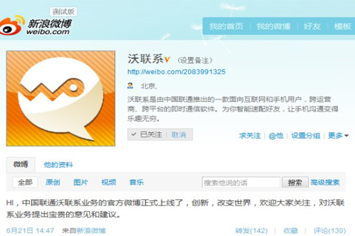 昨日下午,中國聯(lián)通“沃聯(lián)系”業(yè)務官方微博正式上線,而在稍后晚間,中國聯(lián)通官方微博也對此微博進行推介,并稱“中國聯(lián)通即將推出一款面向互聯(lián)網(wǎng)和手機用戶,跨運營商、跨平臺的即時通信軟件‘沃聯(lián)系’。為幫助用戶朋友更好了解和使用這款即將上線的產品,中國聯(lián)通沃聯(lián)系產品組現(xiàn)已開通@沃聯(lián)系新浪官方微博,敬請關注!