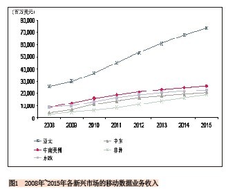 就絕對值來看亞太地區(qū)的新興市場將占主導(dǎo)地位,該地區(qū)的移動數(shù)據(jù)業(yè)務(wù)收入將從2010年的368億美元增長到2015年的734億美元,增長率幾乎為100%。給出這么高的預(yù)測值不足為奇,因為該市場上有中國、印度、印尼“三大巨頭”,這三個國家對該區(qū)域數(shù)據(jù)業(yè)務(wù)收入的貢獻將達到81%。