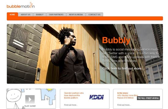 “Bubble Motion”的Bubbly平臺是一個手機(jī)端的語音微博服務(wù),允許用戶通過聲音向他們的關(guān)注者和粉絲發(fā)布狀態(tài)信息,模式與Twitter一樣,只是將文字變成了聲音,微博變成了bubbles,用戶將錄制的聲音更新到手機(jī),然后所有粉絲將收到一條短信通知,點擊短信內(nèi)的鏈接就可以收聽。