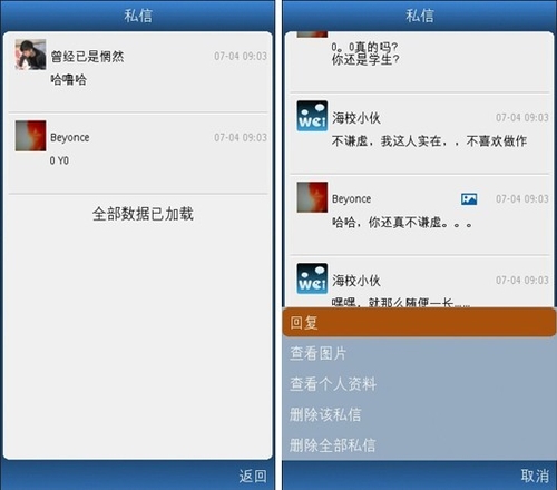 武俠小說(shuō)中每每寫(xiě)到傳音時(shí),都愛(ài)這樣寫(xiě)“不世高人傳音入密……”。這不世高人的稱(chēng)號(hào)可是讓人夢(mèng)寐以求啊。語(yǔ)音微博1.6 for Symbian最新加入的私信功能助你一償夙愿。每每查看其他用戶(hù)以及他的語(yǔ)音微博時(shí),你都可以看到私信按鈕,點(diǎn)擊即可發(fā)送私信。傳音入密就是這樣簡(jiǎn)單。當(dāng)然,除了語(yǔ)音,你也可以傳送文字,很貼心有木有。
