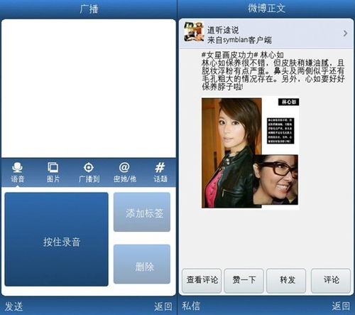 語(yǔ)音微博1.6 for Symbian新加入的私信和經(jīng)驗(yàn)系統(tǒng)的加入使得用戶(hù)間信息的交流更緊密、分享更便捷。從此,千里傳音不是夢(mèng)。