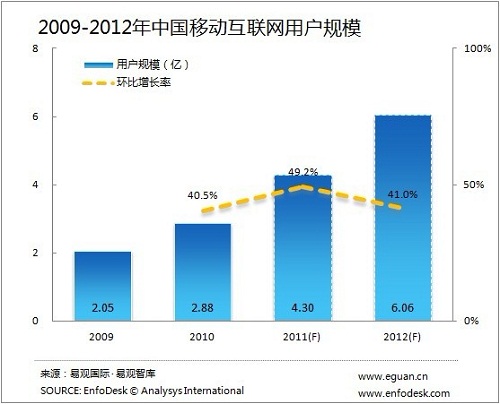 基于EnfoDesk易觀智庫對移動互聯(lián)網(wǎng)的持續(xù)研究,預計2012年市場用戶規(guī)模及從移動互聯(lián)網(wǎng)市場規(guī)模保持相對穩(wěn)定的增長,移動互聯(lián)網(wǎng)用戶數(shù)有機會在2012年突破6億,并且超過互聯(lián)網(wǎng)用戶數(shù)量,智能終端、移動互聯(lián)網(wǎng)應用繼續(xù)延續(xù)2011年的增長速度。