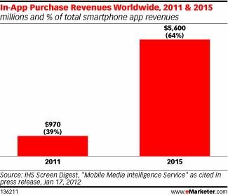 IHS Screen Digest預(yù)計(jì),應(yīng)用內(nèi)置支付將成為移動應(yīng)用營收的新標(biāo)準(zhǔn)。游戲開發(fā)商共同通過向用戶提供免費(fèi)應(yīng)用下載服務(wù),然后向用戶進(jìn)入新層次內(nèi)容收取費(fèi)用已證明這種“免費(fèi)增值”模式非常的成功。IHS Screen Digest預(yù)計(jì),到2015年,應(yīng)用內(nèi)置支付將占據(jù)智能手機(jī)應(yīng)用營收總額的64%,遠(yuǎn)超過2011年的39%。