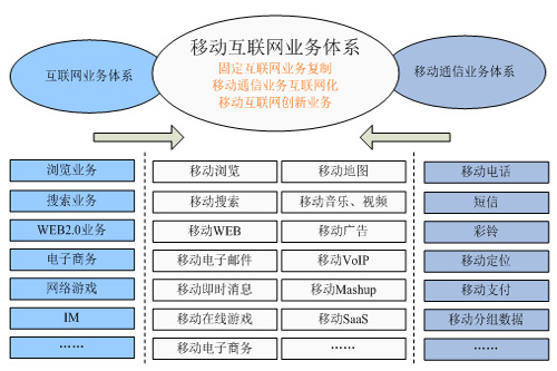 根據(jù)工信部相關信息,移動互聯(lián)網(wǎng)的業(yè)務體系主要包括三大類,如下圖所示:一是固定互聯(lián)網(wǎng)的業(yè)務向移動終端的復制,從而實現(xiàn)移動互聯(lián)網(wǎng)與固定互聯(lián)網(wǎng)相似的業(yè)務體驗,這是移動互聯(lián)網(wǎng)業(yè)務的基礎。二是移動通信業(yè)務的互聯(lián)網(wǎng)化,如Skype推出的移動VOIP業(yè)務、中國移動的飛信業(yè)務等。三是結合移動通信與互聯(lián)網(wǎng)功能而進行的有別于固定互聯(lián)網(wǎng)的業(yè)務創(chuàng)新,這是移動互聯(lián)網(wǎng)業(yè)務發(fā)展方向。對創(chuàng)業(yè)者而言,移動互聯(lián)網(wǎng)的業(yè)務創(chuàng)新關鍵是如何將移動通信的網(wǎng)絡能力與互聯(lián)網(wǎng)的網(wǎng)絡與應用能力進行聚合,從而創(chuàng)新出適合移動終端的互聯(lián)網(wǎng)業(yè)務,如移動Web2.0業(yè)務,如微博、移動位置類互聯(lián)網(wǎng)業(yè)務等。