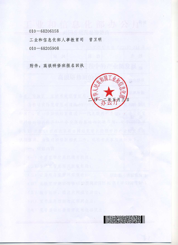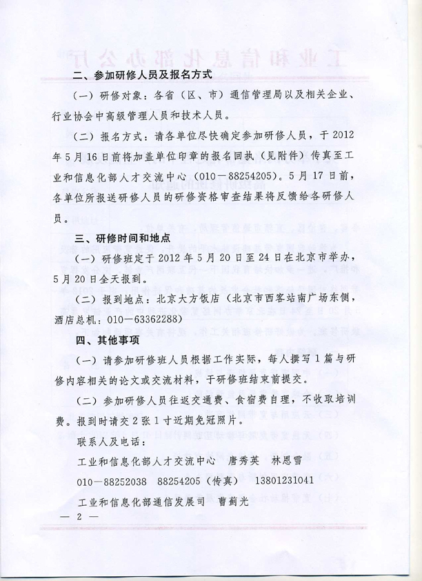 報(bào)名方式:請(qǐng)各單位盡快確定參加研修人員,于2012年5月16日前將加蓋單位印章的報(bào)名回執(zhí)(附后)傳真至工業(yè)和信息化部人才交流中心(010-88254205)。5月17日前,各單位所報(bào)送研修人員的研修資格審查結(jié)果將反饋給各研修人員。