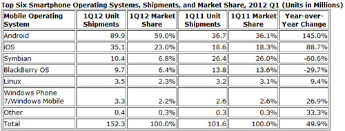 Android和蘋果的iOS繼續(xù)主導(dǎo)全球智能手機行業(yè),這兩個平臺的總出貨量占到2012年一季度所有智能手機出貨量的82%。其中Android手機以8900萬臺占據(jù)整個行業(yè)出貨量的59%,而蘋果以3510萬臺的出貨量占據(jù)23%的市場份額。這些數(shù)據(jù)均來自IDC的最新研究報告。