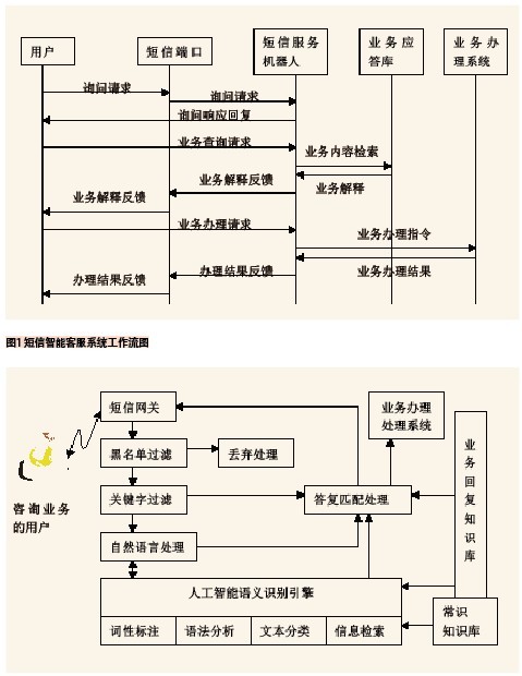 人工智能技術(shù)的引入讓機(jī)器能替代人工服務(wù)為用戶提出的問題和請求做出類人的處理和反饋。在計(jì)算機(jī)系統(tǒng)上實(shí)現(xiàn)人工智能的有兩種不同的方式。一種是工程學(xué)方法,采用傳統(tǒng)的編程技術(shù),使系統(tǒng)呈現(xiàn)近似人類智能的輸出結(jié)果,并不考慮所用方法是否與人或動物機(jī)體所用的方法相同。另一種是模擬法,它不僅要獲得類人的輸出結(jié)果,還要求實(shí)現(xiàn)方法也和人類或生物機(jī)體所用的方法相同或相類似。目前主要在工程學(xué)方法實(shí)現(xiàn)人工智能中有較成熟的商用技術(shù),短信自助服務(wù)系統(tǒng)也基于該方法實(shí)現(xiàn)。