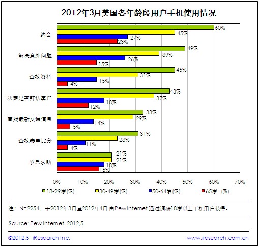 iResearch艾瑞咨詢根據(jù)Pew Internet 2012年5月發(fā)布的數(shù)據(jù)整理發(fā)現(xiàn),美國各年齡段手機用戶中,18-29歲的用戶使用手機程度最為頻繁,主要用于“約會”“解決意外問題”及“查找資料”上。相比其他年齡段用戶群,年輕用戶更偏向利用移動手機來獲取信息。