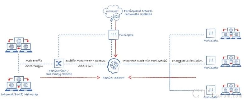 此外,AI技術還貫穿于Fortinet的多個產品與功能中,形成高效的工作流。以威脅檢測與響應為例,當FortiGate的雙引擎也無法確定某個文件的合法性時,它可以將該文件提交給FortiNDR進行深度分析,利用云端深度神經網(wǎng)絡AI進行0 Day攻擊、勒索軟件等深層次分析。若仍無法確定,還可進一步提交給FortiSandbox,在虛擬機環(huán)境中進行模擬操作,進行更為深入的檢測。在這一系列流程與技術的支持下,F(xiàn)ortinet的威脅檢測與響應能力已達到業(yè)界頂尖水平,向滿分100分邁進。