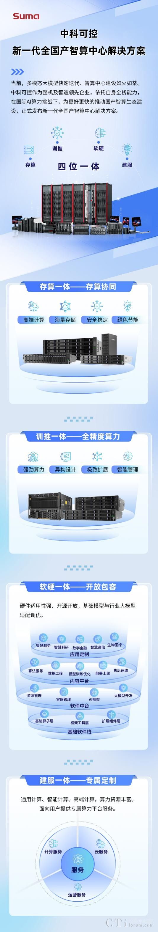 作為整機及智造領先企業(yè),中科可控一直堅持國產自主路線,結合當下行業(yè)對于AI技術的需求,在原有通用解決方案的基礎上,全面推出新一代全國產智算中心解決方案。該方案通過“存算+訓推+軟硬+建服”四位一體的理念,推動國產智算生態(tài)建設,賦能千行百業(yè)數(shù)智化轉型。