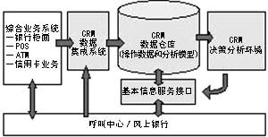 在CRM數(shù)據(jù)倉(cāng)庫(kù)中,實(shí)際數(shù)據(jù)分為操作數(shù)據(jù)和分析模型。操作數(shù)據(jù)包括客戶基本信息、客戶賬務(wù)信息和操作控制(客戶個(gè)性化服務(wù)信息)。分析模型包括客戶關(guān)系管理的所有分析模型、市場(chǎng)分析、客戶信用度分析、客戶滿意度分析和銷售行為分析。因此,CRM的主體部分將通過(guò)數(shù)據(jù)集成系統(tǒng)與業(yè)務(wù)處理部分(綜合柜面系統(tǒng)等)和客戶聯(lián)系部分(呼叫中心等)連接起來(lái)。同時(shí),由于業(yè)務(wù)處理部分一般都采用銀行的現(xiàn)有系統(tǒng),而呼叫中心則可以成為一個(gè)相對(duì)獨(dú)立的模塊,因此,銀行CRM系統(tǒng)的實(shí)施主要體現(xiàn)在CRM數(shù)據(jù)集成系統(tǒng)、CRM數(shù)據(jù)倉(cāng)庫(kù)、CRM決策分析環(huán)境、基本信息服務(wù)接口等四大部分。