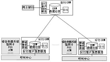 由于銀行在各地建有大量的分支機(jī)構(gòu),銀行CRM系統(tǒng)一般都采用分布式數(shù)據(jù)倉(cāng)庫(kù)環(huán)境,即所有分行均擁有自己的CRM系統(tǒng),并與本地綜合業(yè)務(wù)系統(tǒng)及呼叫中心連接。在總行建有中心CRM數(shù)據(jù)倉(cāng)庫(kù),提供面向全行的分析決策功能,并為網(wǎng)上銀行業(yè)務(wù)提供數(shù)據(jù)查詢支持。