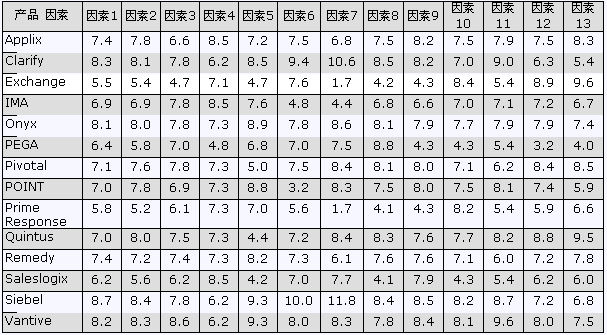 下表摘自Gartner Group 2000年六月份對14種CRM廠商和產(chǎn)品的比較。原來的報告以柱狀圖的形式進行比較,為了縮短篇幅,我們轉化為表格形式借以引用。