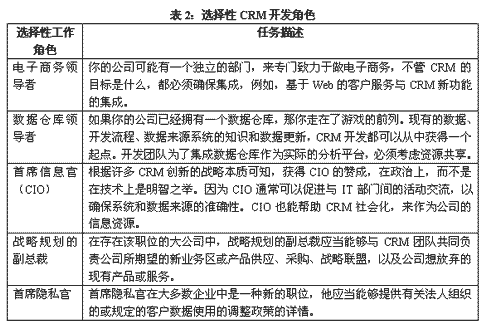根據(jù)你的CRM項(xiàng)目的廣泛性和復(fù)雜性,對(duì)于在表2中列出的工作角色,你可以有選擇地在CRM開發(fā)中添加。