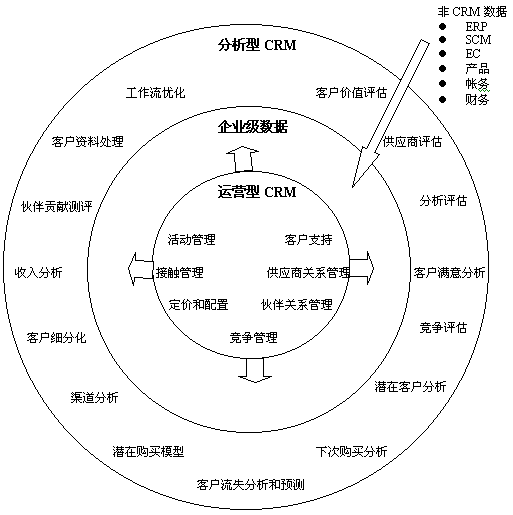 能提供上述問題和其他企業(yè)問題的客戶信息,就能夠?qū)蛻舴⻊?wù)、銷售技巧和隨后的促銷戰(zhàn)略作出關(guān)鍵決策。通過對“運營型”CRM數(shù)據(jù)與來自于全公司的信息進行集成,公司便能夠開始執(zhí)行分析型CRM;并且執(zhí)行后,可以作出真正的“以客戶為中心”的企業(yè)決策。