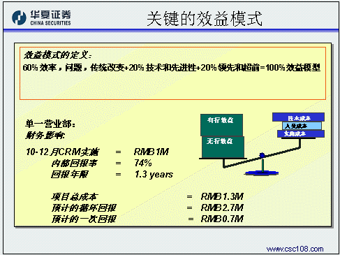 華夏證券經(jīng)紀(jì)業(yè)務(wù)總部的姚磊作為唯一的成功應(yīng)用案例代表,主要是和與會(huì)的金融機(jī)構(gòu)分享在客戶關(guān)系管理規(guī)劃方面的一些成功經(jīng)驗(yàn)。華夏證券認(rèn)為,對(duì)于證券公司的經(jīng)紀(jì)業(yè)務(wù)來(lái)講,客戶關(guān)系管理的主要目標(biāo)應(yīng)該是把客戶關(guān)系管理系統(tǒng)的核心功能融入開(kāi)戶、交易、服務(wù)、咨詢等四個(gè)與客戶互動(dòng)的過(guò)程之中,比如:客戶資料規(guī)戶整合形成統(tǒng)一的客戶號(hào),管理客戶交易偏好和產(chǎn)品偏好上的變化,配合多種渠道建立一對(duì)一銷售流程,客戶終身價(jià)值管理。在風(fēng)險(xiǎn)控制方面,華夏證券同樣貢獻(xiàn)了寶貴的經(jīng)驗(yàn),在這方面他們認(rèn)為最重要的方面是要做好高層領(lǐng)導(dǎo)的灌輸和培訓(xùn)工作,讓企業(yè)的高層領(lǐng)導(dǎo)對(duì)于客戶關(guān)系管理有一個(gè)正確的理解,從而對(duì)于項(xiàng)目的投資有一個(gè)合理的預(yù)期和實(shí)證,通俗一點(diǎn)說(shuō),就是首先為整個(gè)項(xiàng)目找一個(gè)合適的發(fā)起人。第二點(diǎn)要注意,要有專業(yè)的項(xiàng)目管理隊(duì)伍,這其實(shí)就是集成商選擇方面的風(fēng)險(xiǎn)。除此之外,還要對(duì)項(xiàng)目要有一個(gè)明確的定義,關(guān)注每一步提交的結(jié)果,在項(xiàng)目過(guò)程中就隨時(shí)發(fā)現(xiàn)問(wèn)題、解決問(wèn)題。