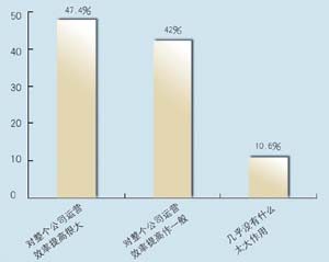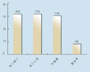 在問到實(shí)施周期上,有9家表示希望在3個月內(nèi)完成,占到47.4%,有6家接受3~6個月的周期,超過6個月的周期已經(jīng)顯得太長。在問到CRM的實(shí)施效果上,有9家認(rèn)為對公司運(yùn)營效率有很大提高,8家認(rèn)為作用一般,只有2家認(rèn)為沒有作用。表明基本上企業(yè)認(rèn)可CRM的作用。在問到是否有專門人員負(fù)責(zé)CRM時,有6家表示有專門部門,有6家有專門人員,合計(jì)占62%,說明企業(yè)非常重視CRM的應(yīng)用。