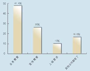 在問到對CRM的熟悉程度方面,有12家表示熟悉,占到63.2%,另有7家表示不熟悉,說明許多企業(yè)已經(jīng)對CRM有一定了解,不過也仍有相當(dāng)大的市場空間。其中有8家建立了CRM系統(tǒng),占到42%,計(jì)劃建立的有9家,占到47.4%,而有2家表示短期不會建立。從調(diào)查發(fā)現(xiàn),幾乎所有受訪者都接受和認(rèn)同CRM,盡管有一些企業(yè)還不熟悉,但在調(diào)查問卷中對此表現(xiàn)出極大的興趣。在CRM的采購動機(jī)上,有9家表示是為了提高業(yè)務(wù),占到將近一半的比例(47.4%),而有5家表示出于企業(yè)宣傳,2家屬于上級主管部門要求,有3家表示是出于同行的示范。調(diào)查顯示,企業(yè)獲得CRM的信息來源很廣,最多的是通過報刊雜志的廣告,有6家,占31.6%,而上級推薦和供應(yīng)商推薦各有4家,各占21%,有兩家是集成商推薦,此外還有3家通過展會獲得相關(guān)信息。