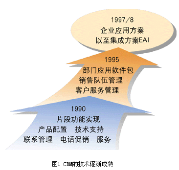 ----二是CRM的技術(shù)逐漸走向成熟(見圖1)。1990年左右,CRM方案只是片斷功能的實(shí)現(xiàn),到1995年以來、1997/8年以來,逐漸出現(xiàn)了部門級應(yīng)用軟件包、企業(yè)級應(yīng)用方案。有些企業(yè)甚至已經(jīng)開始關(guān)心自己原有的ERP系統(tǒng)與正在建設(shè)的CRM系統(tǒng)之間的集成問題。