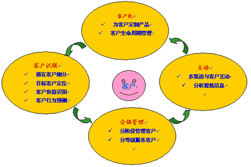 流程涉及到客戶(hù)生命周期管理、知識(shí)管理的流程。具體來(lái)說(shuō),流程涉及到兩大方面,其一,CRM成功實(shí)施后的企業(yè),應(yīng)該在業(yè)務(wù)流程上一個(gè)變革。企業(yè)各個(gè)部門(mén)開(kāi)展業(yè)務(wù)的共同前提是:以客戶(hù)為中心。其二,企業(yè)應(yīng)當(dāng)通過(guò)CRM來(lái)建立一種客戶(hù)管理的優(yōu)化流程,從客戶(hù)識(shí)別,到分級(jí)管理,再到企業(yè)與客戶(hù)互動(dòng),再到為客戶(hù)定制產(chǎn)品;然后循環(huán)往復(fù)。具體我們可以參見(jiàn)下圖: