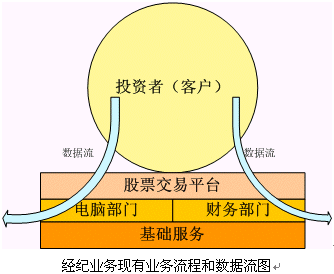 。。從上圖可以看出,現(xiàn)在的證券公司的經(jīng)紀(jì)業(yè)務(wù)為各個(gè)股民或者說(shuō)投資者所提供的服務(wù)就是交易平臺(tái)的服務(wù),也就是交易通道服務(wù)。營(yíng)業(yè)部的其他服務(wù)都是為這個(gè)交易通道服務(wù),這些服務(wù)品種都是非;A(chǔ)的。而營(yíng)業(yè)部的數(shù)據(jù)流,也就是各個(gè)客戶的基本信息和交易信息,通過(guò)電腦部和財(cái)務(wù)部門(mén)就走到了終結(jié),沒(méi)有被更好的利用。