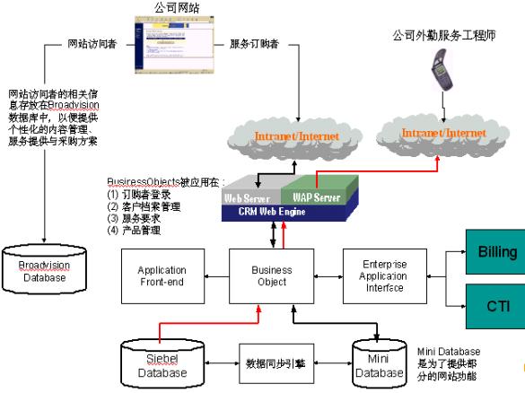 公司挑選了方案一作為客戶數(shù)據(jù)的錄入與存儲方式,即,將Siebel數(shù)據(jù)庫作為公司客戶的數(shù)據(jù)中心,并且采用了將數(shù)據(jù)直接錄入到Siebel數(shù)據(jù)庫的方法。同時,由于Siebel數(shù)據(jù)庫中的部分數(shù)據(jù)將為網(wǎng)上服務(wù)提供信息,考慮到系統(tǒng)的安全性與性能,公司另建了一個微型數(shù)據(jù)庫,其整體的系統(tǒng)構(gòu)架見下圖。