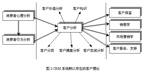 大多數(shù)CRM研究人員和應(yīng)用專(zhuān)家不認(rèn)為CRM存在作為應(yīng)用支撐的理論基礎(chǔ),充其量認(rèn)為CRM只是支持企業(yè)營(yíng)銷(xiāo)的商業(yè)策略。隨著企業(yè)追求市場(chǎng)活動(dòng)績(jī)效的熱情的提高,企業(yè)開(kāi)始采用定性和定量的分析方法決策其與市場(chǎng)和客戶(hù)有關(guān)的企業(yè)活動(dòng),如有效的客戶(hù)滿(mǎn)意度評(píng)價(jià)、客戶(hù)分類(lèi)、客戶(hù)盈利率分析等。而這些決策迫切需要相關(guān)的理論基礎(chǔ)為指導(dǎo),真正擺脫靠經(jīng)驗(yàn)進(jìn)行決策的做法。當(dāng)前CRM的理論研究和學(xué)術(shù)探討并未真正走向體系化、統(tǒng)一化,所以造成CRM市場(chǎng)中提供的功能參差不齊。CRM系統(tǒng)必須存在一個(gè)完整的理論體系為指導(dǎo),本文將CRM系統(tǒng)賴(lài)以存在的理論基礎(chǔ)統(tǒng)稱(chēng)為客戶(hù)理論(Theory on Customer)。