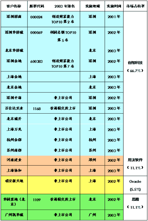在國務(wù)院發(fā)展研究中心企業(yè)研究所、清華大學(xué)房地產(chǎn)研究所和搜房研究院共同發(fā)起評比的"中國房地產(chǎn)TOP10"中已經(jīng)有3家企業(yè)導(dǎo)入CRM,它們是:居財富創(chuàng)造能力TOP10第2位的深圳招商;居利潤總額TOP10第5位的深圳華僑城;居財富創(chuàng)造能力TOP10第7位的深圳金地。截止2003年10月底,只有創(chuàng)智科技公司為"中國房地產(chǎn)TOP10"提供了房地產(chǎn)CRM解決方案。