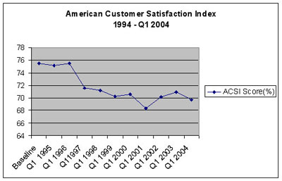 再看美國客戶滿意度指數(shù)(ACSI)的統(tǒng)計,顯示客戶滿意度正在逐步下跌,考慮到這一點(diǎn),很明顯可以看出人們正越來越脫離客戶的本質(zhì)。