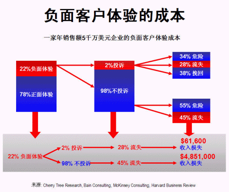 一家年銷(xiāo)售額五千萬(wàn)美元的企業(yè),假設(shè)正面客戶(hù)體驗(yàn)為78%,負(fù)面體驗(yàn)為22%,在所有負(fù)面體驗(yàn)中,只有2%的客戶(hù)投訴,其余98%大多數(shù)均不投訴,保持沉默(這與現(xiàn)實(shí)情況頗為吻合)。在2%投訴客戶(hù)中,有34%經(jīng)過(guò)處理仍然未能令客戶(hù)完全滿(mǎn)意,尚有流失的危險(xiǎn);28%的客戶(hù)在處理后依然流失,余下38%的客戶(hù)則感到滿(mǎn)意,繼續(xù)留下。對(duì)大部分(98%)沒(méi)有投訴的客戶(hù),因公司對(duì)他們的不滿(mǎn)意并不知情,所以沒(méi)有采取行動(dòng),55%的客戶(hù)有隨時(shí)流失的危險(xiǎn),其余45%已經(jīng)流失。