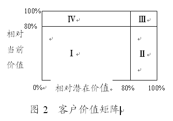 (二)確定客戶當(dāng)前相對(duì)價(jià)值和客戶相對(duì)潛在價(jià)值通過預(yù)測,識(shí)別出了客戶當(dāng)前價(jià)值CCV和增值潛力CPV。但是,這兩個(gè)維度指標(biāo),均以絕對(duì)價(jià)值形式出現(xiàn)對(duì)客戶進(jìn)行細(xì)分并不理想(張國方,金國棟,2003(3)),在一定程度上會(huì)影響到理論應(yīng)用的方便性(簡便性)。因此,可以采用更加明了和更具有實(shí)踐操作性的維度指標(biāo)——客戶當(dāng)前相對(duì)價(jià)值和客戶相對(duì)潛在價(jià)值!翱蛻舻南鄬(duì)當(dāng)前價(jià)值”是指某一客戶提供的當(dāng)前價(jià)值與企業(yè)未來可望實(shí)現(xiàn)的當(dāng)前價(jià)值總額的比值;而“客戶的相對(duì)潛在價(jià)值”是某一客戶提供的增值價(jià)值與企業(yè)未來可望實(shí)現(xiàn)的全部最大增值價(jià)值的比值。