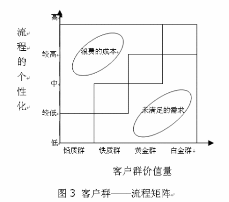 圖中橫軸代表客戶群價(jià)值量,從“鉛質(zhì)客戶群”到“白金客戶群”過渡?v軸表示業(yè)務(wù)流程的個(gè)性化程度(包括流程的靈活性、流程的活動(dòng)承擔(dān)者的設(shè)置、流程中的活動(dòng)要素的配置等),是一種與客戶群價(jià)值量相對(duì)應(yīng)的供應(yīng)方面的流程特征。左上方的橢圓圈表示對(duì)價(jià)值量低的鉛質(zhì)群、鐵質(zhì)群客戶設(shè)置了個(gè)性化較高的流程,這表明企業(yè)資源配置不合理,因而有些資源的投入大于產(chǎn)出,從而產(chǎn)生過高的成本。右下方的橢圓圈則代表了未被滿足的需求。用很標(biāo)準(zhǔn)化的、缺乏人情味的流程向高價(jià)值的黃金群客戶、白金群客戶提供產(chǎn)品和服務(wù),將難以讓這些客戶滿意,從而導(dǎo)致高價(jià)值客戶的流失。圖的中間部分,四個(gè)矩形框的對(duì)角線位置則代表了客戶群價(jià)值和流程個(gè)性化恰當(dāng)?shù)钠ヅ。因此,企業(yè)可在四個(gè)矩形框的各自兩條對(duì)角線相交部分設(shè)置“白金客戶群流程、黃金客戶群流程、鐵質(zhì)客戶群流程、鉛質(zhì)客戶群流程”這四類流程,以此找到客戶群——由資源創(chuàng)造的產(chǎn)品和服務(wù)——流程群的最佳匹配。從圖中也可看出,鉛質(zhì)客戶群流程的標(biāo)準(zhǔn)化程度最高,通常不用提供特殊的個(gè)性化的服務(wù)及產(chǎn)品。白金群客戶流程的定制化則最高,企業(yè)需要為其量身打造流程。顯然這兩個(gè)流程的資源分配存在極大的差異。