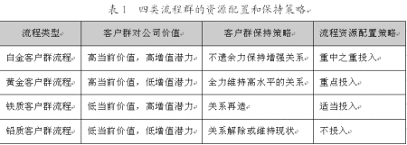 流程由活動(dòng)、活動(dòng)的邏輯順序、活動(dòng)的實(shí)現(xiàn)方式、活動(dòng)的承擔(dān)者四個(gè)基本要素組成。通過活動(dòng)的整合來產(chǎn)生“流程多面手”或活動(dòng)講廢除來減少成本,利用信息技術(shù)將“串聯(lián)”活動(dòng)變成“并聯(lián)”活動(dòng)來改變活動(dòng)斬邏輯順序以提高流程效率,或者改變活動(dòng)承擔(dān)者的數(shù)量或素質(zhì),這些都將導(dǎo)致流程群資源分配的變動(dòng)。例如,銀行的業(yè)務(wù)流程設(shè)置:低價(jià)值客戶以電子設(shè)備的自助服務(wù)為主;中價(jià)值客戶以柜面服務(wù)為主;高價(jià)值客戶以大戶室一對(duì)一服務(wù)為主;設(shè)置專業(yè)化的理財(cái)中心,由客戶經(jīng)理全程代為辦理各項(xiàng)業(yè)務(wù),同時(shí)由高素質(zhì)的理財(cái)專家根據(jù)客戶的風(fēng)險(xiǎn)收益偏好提供高質(zhì)量的理財(cái)產(chǎn)品等?梢,不同客戶其流程的資源配置差異較大。依據(jù)客戶群——流程矩陣,下表描述了四類流程群所對(duì)應(yīng)的四類客戶群的四種資源配置方式。